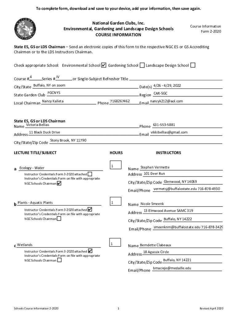 To complete form, download and save to your device, add your information, then save again. National Garden Clubs, Inc. Environmental, Gardening and Landscape Design Schools COURSE INFORMATIONCourse