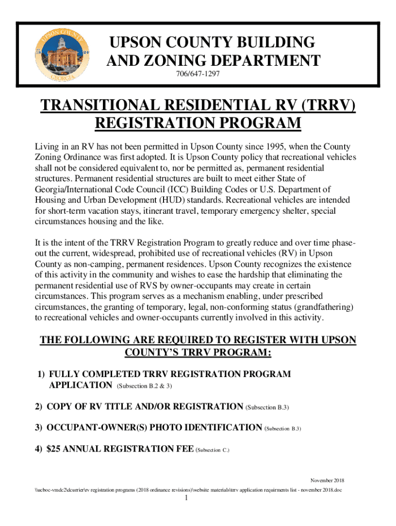 UPON COUNTY BUILDING AND ZONING DEPARTMENT 706/6471297TRANSITIONAL RESIDENTIAL RV (TR RV) REGISTRATION PROGRAM Living in an RV has not been permitted in Upon County since 1995, when the County Zoning