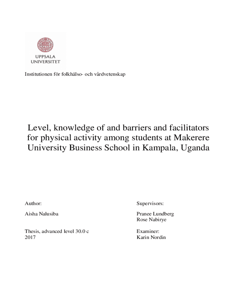 Institutionen for folks och vrdvetenskapLevel, knowledge of and barriers and facilitators for physical activity among students at Maker ere University Business School in Kampala, UgandaAuthor:Supervisors:Aisha