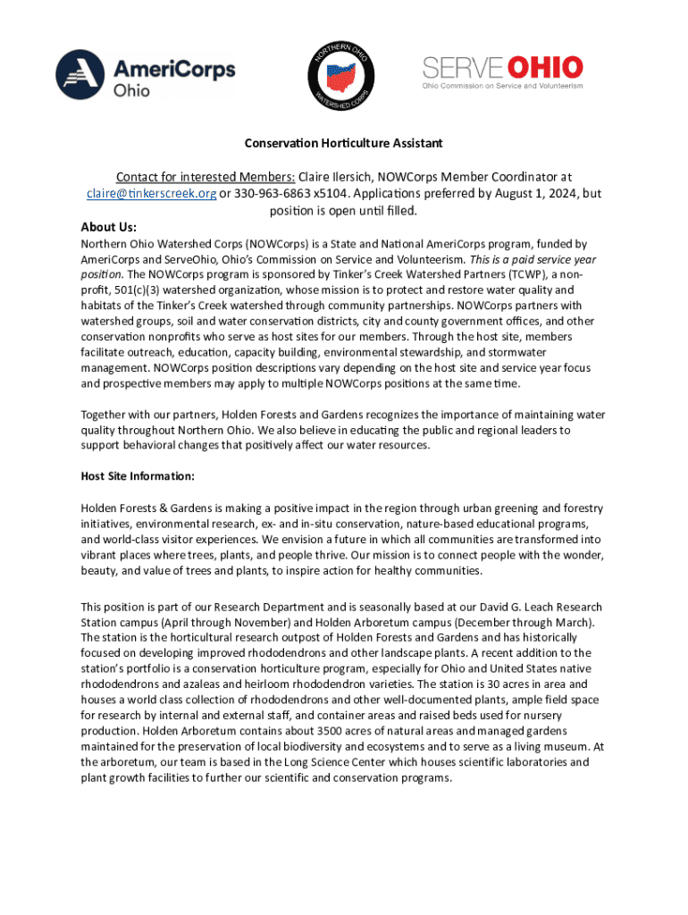 Conservation Horticulture Assistant Contact for interested Members: Claire Ilersich, NOWCorps Member Coordinator at claire@tinkerscreek.org or 3309636863 x5104. Applications preferred by August 1,