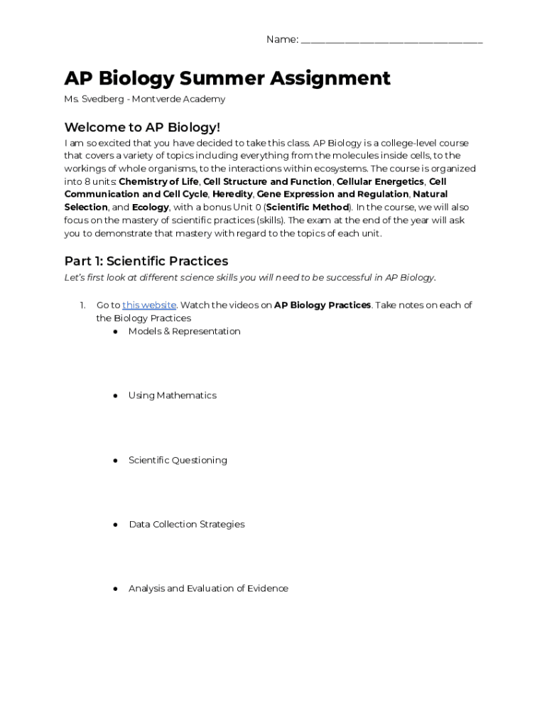 Name: ___AP Biology Summer Assignment Ms. Svedberg Montverde AcademyWelcome to AP Biology! I am so excited that you have decided to take this class. AP Biology is a collegelevel course that covers
