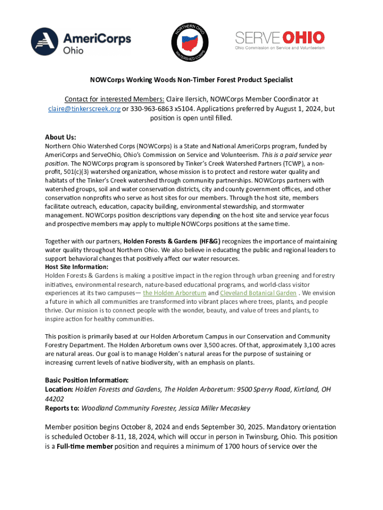 NOWCorps Working Woods NonTimber Forest Product Specialist Contact for interested Members: Claire Ilersich, NOWCorps Member Coordinator at claire@tinkerscreek.org or 3309636863 x5104. Applications