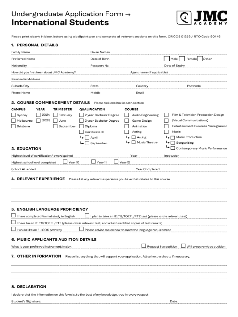Undergraduate Application FormInternational Students Please print clearly in block letters using a ballpoint pen and complete all relevant sections on this form. CRICKS 01259J RTO Code 904461. PERSONAL