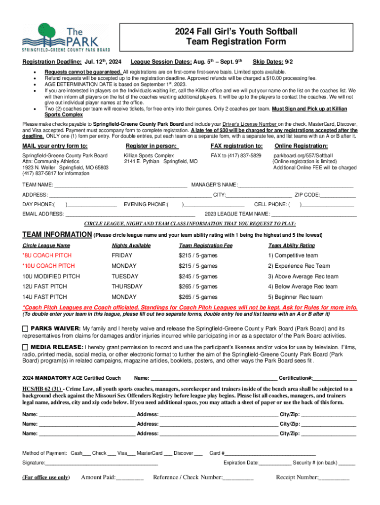 2024 Fall Girls Youth Softball Team Registration Form Registration Deadline: Jul. 12th, 2024 League Session Dates: Aug. 5th Sept. 9thSkip Dates: 9/2Requests cannot be guaranteed. All registrations