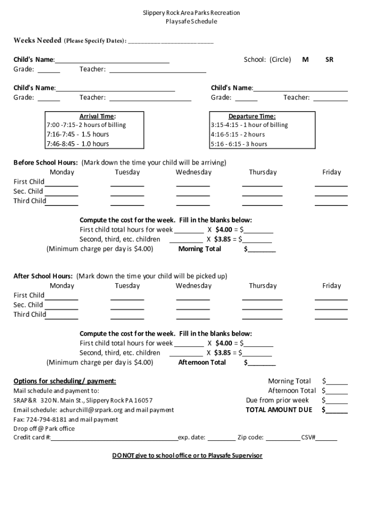 Slippery Rock Area Parks Recreation Playsafe ScheduleWeeks Needed (Please Specify Dates): ___ Child\'s Name:___ Grade: ___ Teacher: ___ Child\'s Name:___ Grade: ___ Teacher: ___ Arrival Time: 7:00
