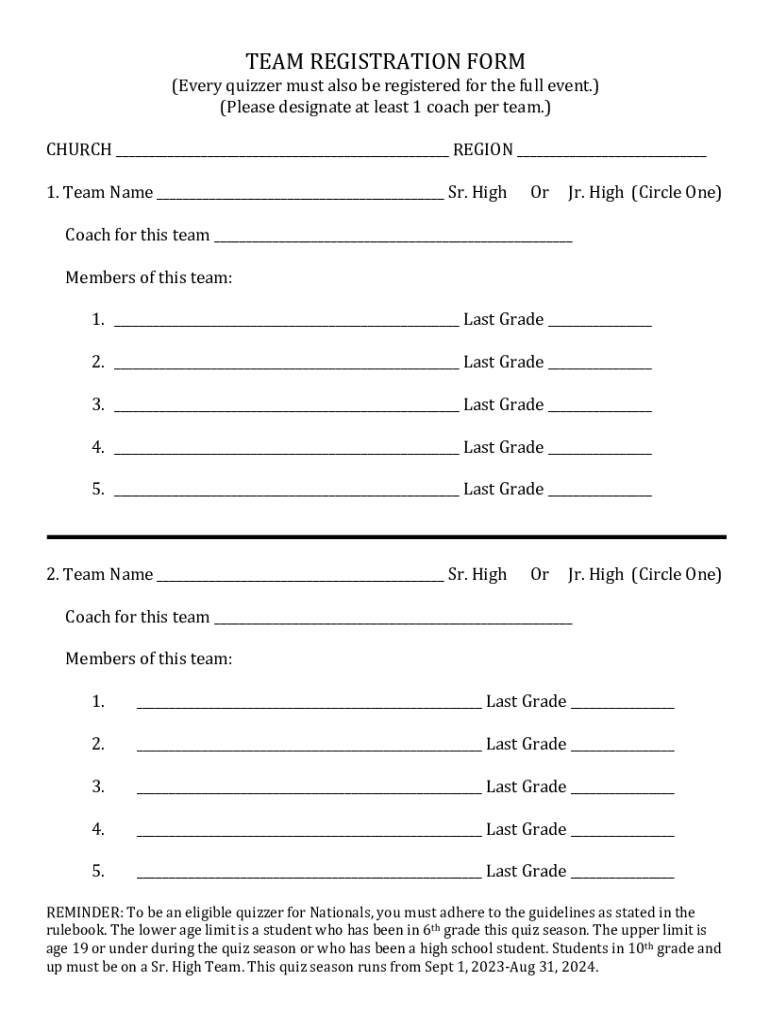 TEAM REGISTRATION FORM (Every quizzer must also be registered for the full event.) (Please designate at least 1 coach per team.) CHURCH ___ REGION ___ 1. Team Name ___ Sr. Higher. High (Circle One)Coach