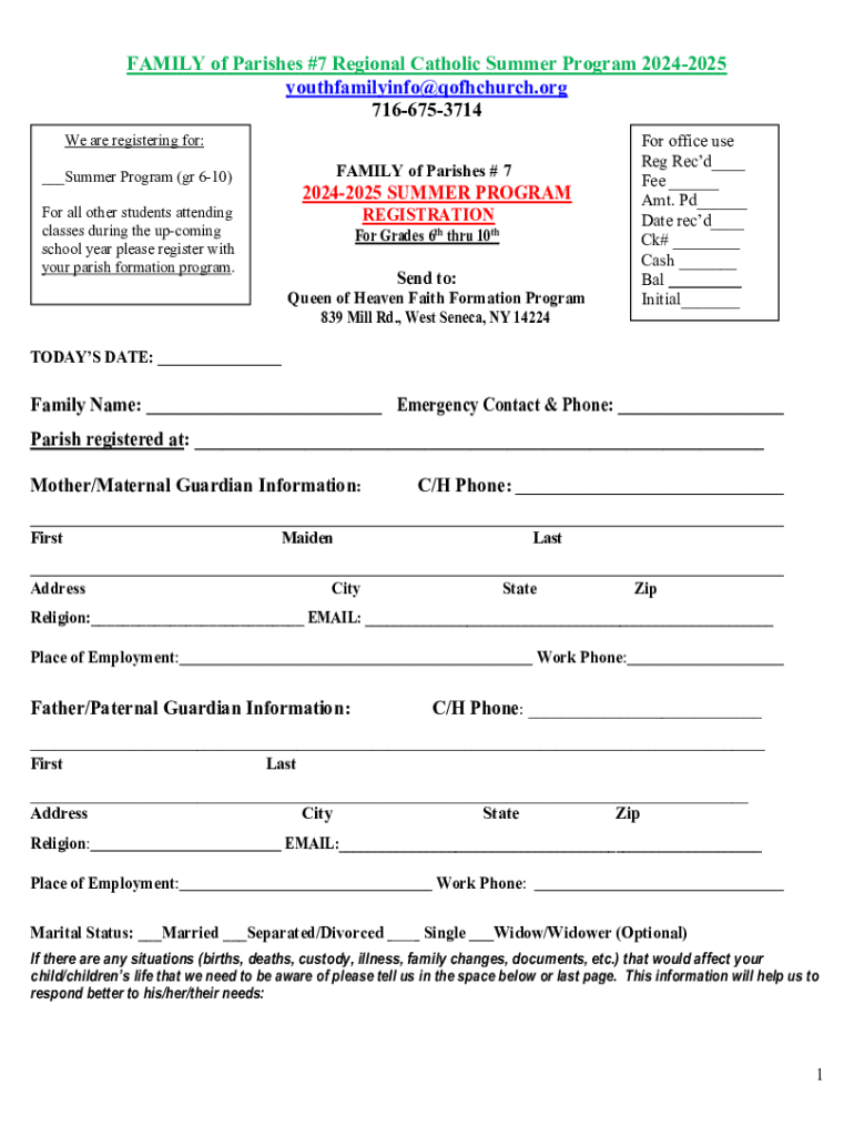 FAMILY of Parishes #7 Regional Catholic Summer Program 20242025 youthfamilyinfo@qofhchurch.org 7166753714 We are registering for: ___Summer Program (gr 610)FAMILY of Parishes # 720242025 SUMMER Programmer