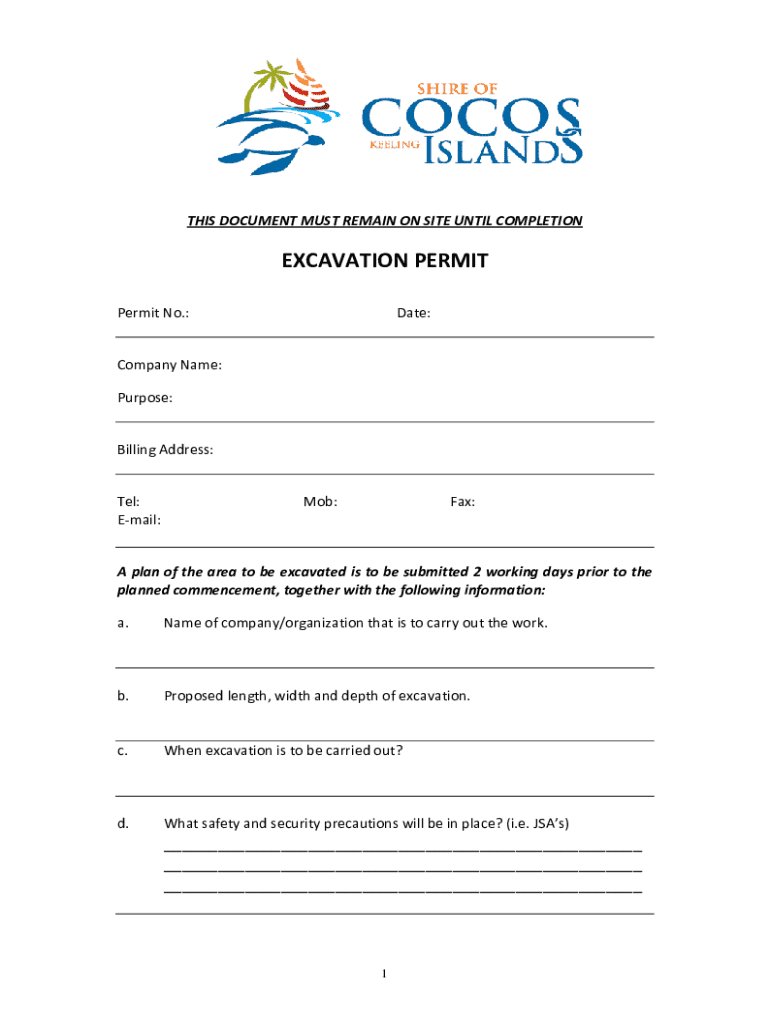 THIS DOCUMENT MUST REMAIN ON SITE UNTIL COMPLETIONEXCAVATION PERMIT Permit No.:Date:Company Name: Purpose: Billing Address: Tel: Email:Mob:Fax:A plan of the area to be excavated is to be submitted