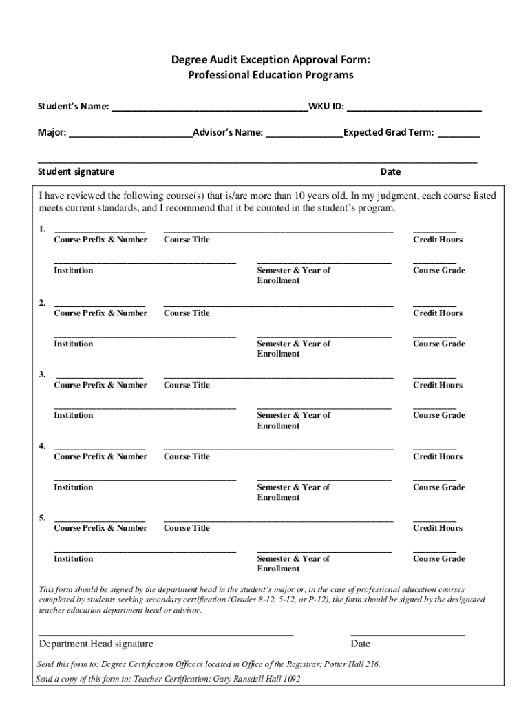 Degree Audit Exception Approval Form: Professional Education Programs Students Name: ___WSU ID: ___ Major: ___Advisors Name: ___Expected Grad Term: ___ ___ Student signature Date I have reviewed the