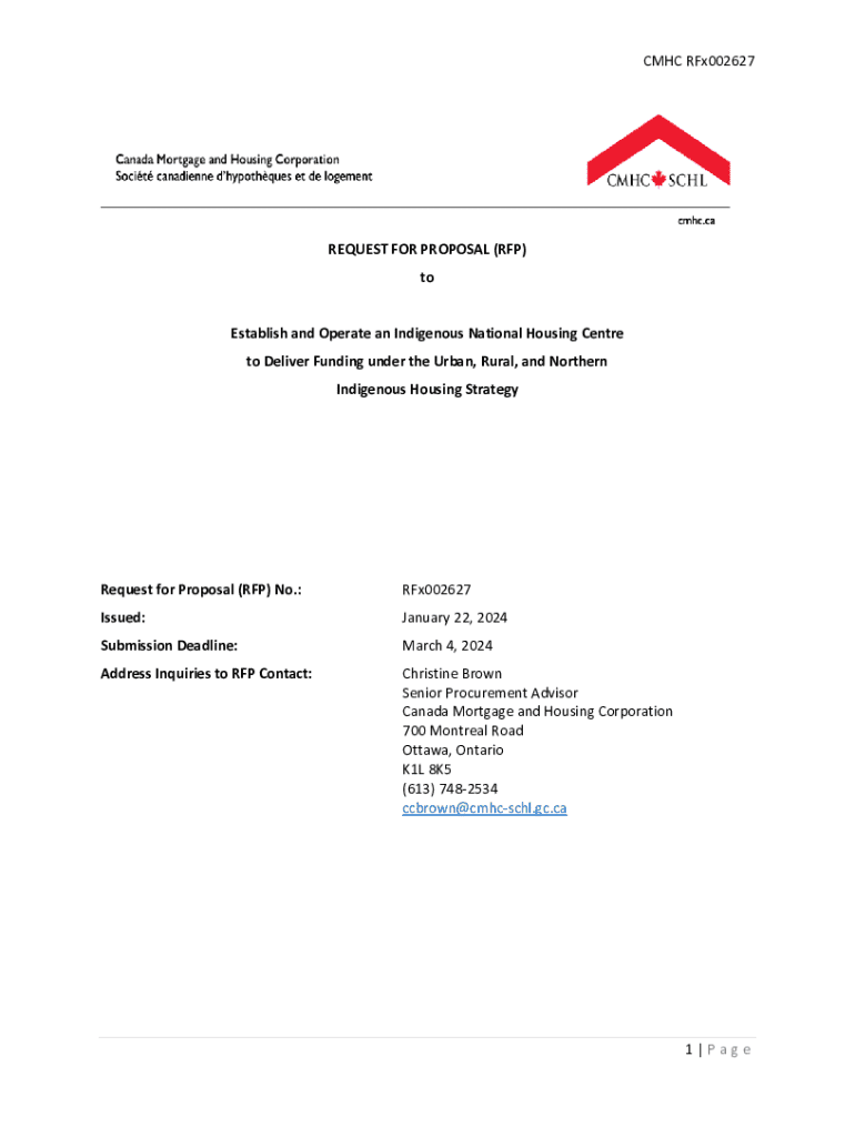 CMHC RFx002627REQUEST FOR PROPOSAL (RFP) to Establish and Operate an Indigenous National Housing Centre to Deliver Funding under the Urban, Rural, and Northern Indigenous Housing StrategyRequest for