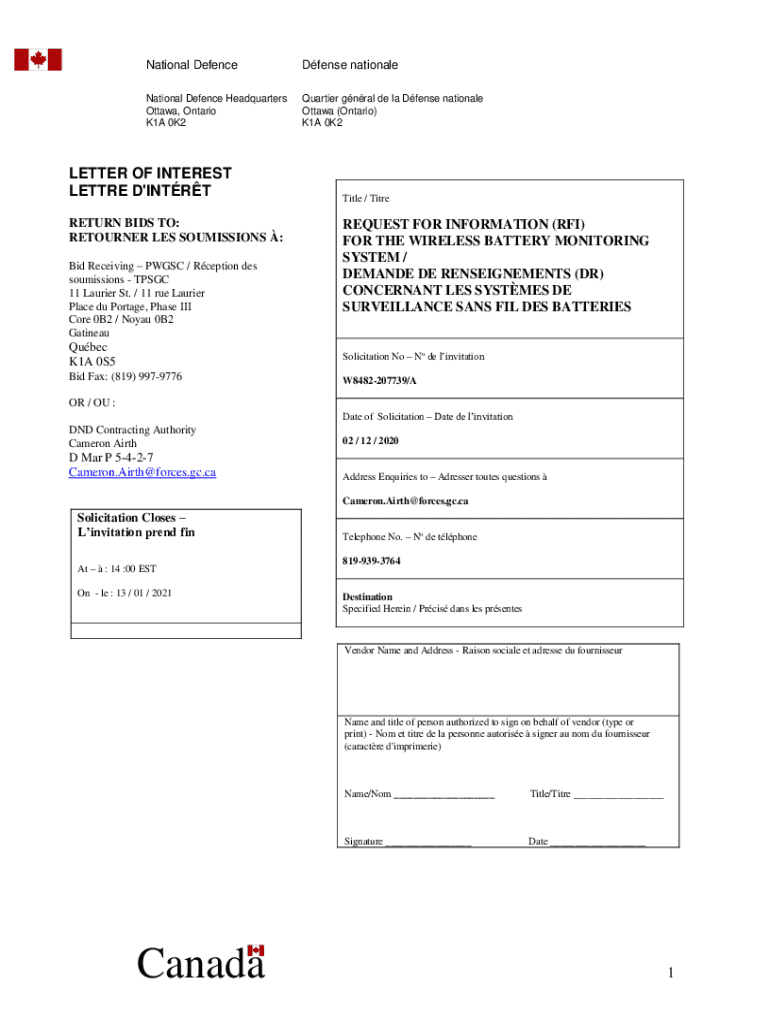 National DefenceDfense nationaleNational Defence Headquarters Ottawa, Ontario K1A 0K2Quartier gnral de la Dfense nationale Ottawa (Ontario) K1A 0K2LETTER OF INTEREST LETTRE D\'INTRT RETURN BIDS TO: