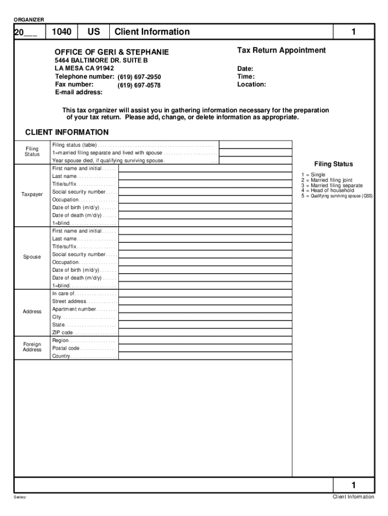 ORGANIZER20___1040USClient Information1OFFICE OF GERI & STEPHANIETax Return Appointment5464 BALTIMORE DR. SUITE B LA MESA CA 91942 Telephone number: (619) 6972950 Fax number: (619) 6970578 Email address:Date: