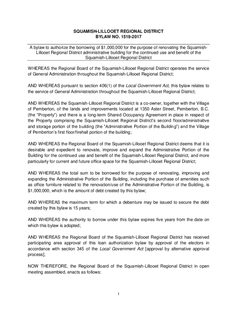 SQUAMISHLILLOOET REGIONAL DISTRICT BYLAW NO. 15192017 A bylaw to authorize the borrowing of $1,000,000 for the purpose of renovating the SquamishLillooet Regional District administrative building
