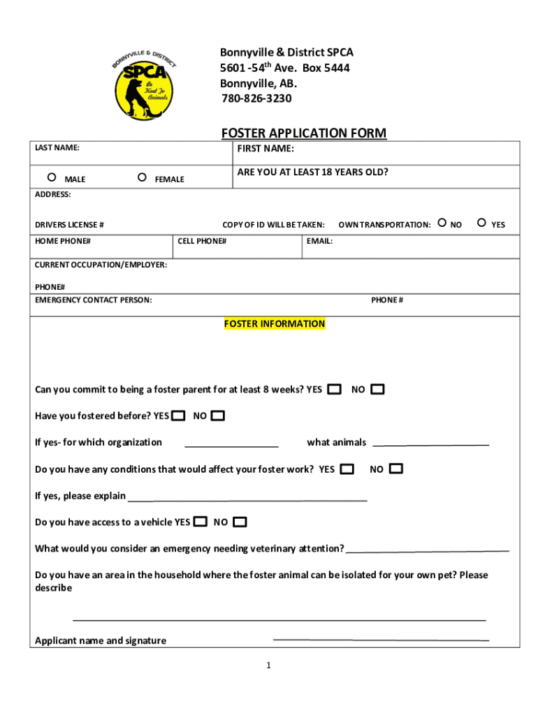 Bonnyville & District SPCA 5601 54th Ave. Box 5444 Bonnyville, AB. 7808263230FOSTER APPLICATION FORM LAST NAME:MALEFIRST NAME:ARE YOU AT LEAST 18 YEARS OLD?FEMALEADDRESS: DRIVERS LICENSE # HOME PHONE#COPY