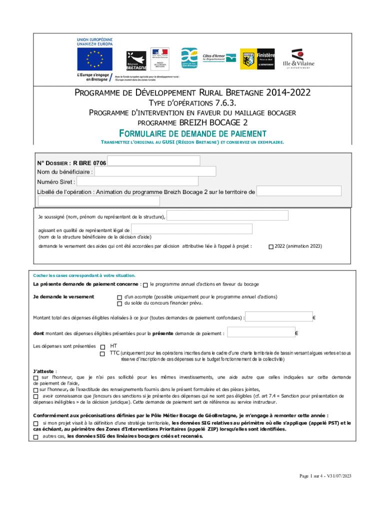 PROGRAMME DE DVELOPPEMENT RURAL BRETAGNE 20142022 TYPE DOPRATIONS 7.6.3. PROGRAMME D\'INTERVENTION EN FAVEUR DU MAILLAGE BOCAGER PROGRAMME BREIZH BOCAGE 2 FORMULAIRE DE DEMANDE DE PAIEMENT TRANSMETTEZ