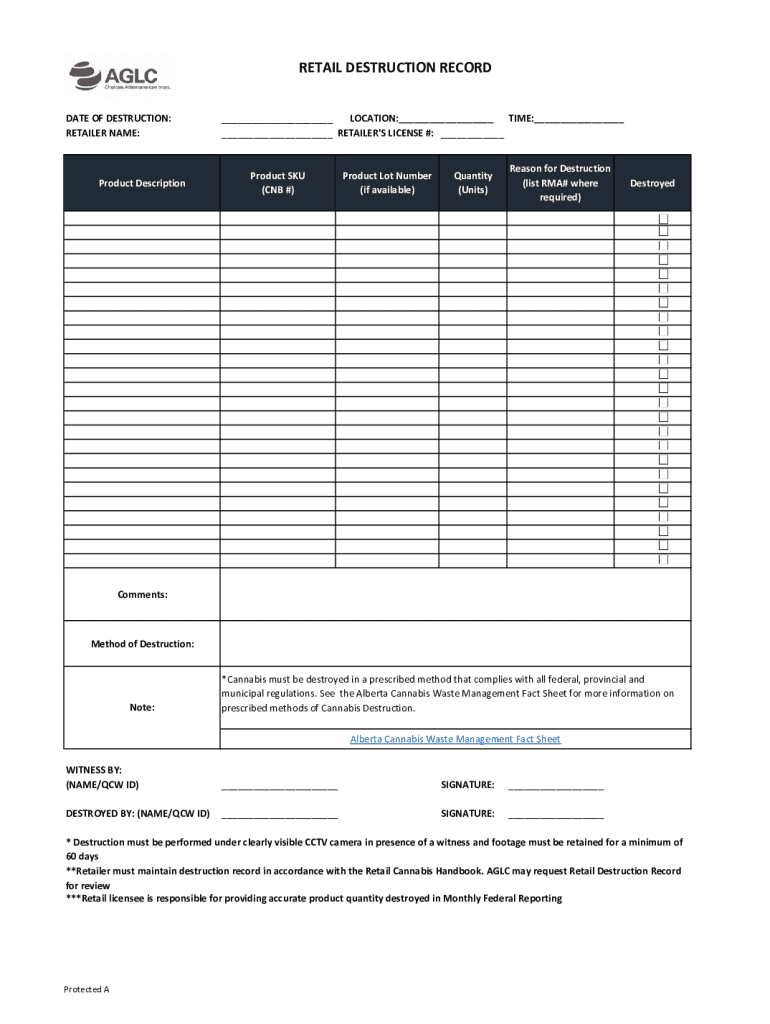RETAIL DESTRUCTION RECORD DATE OF DESTRUCTION: RETAILER NAME:Product Description___ LOCATION:___ TIME:___ ___ RETAILER\'S LICENSE #: ___Product SKU (CNB #)Product Lot Number (if available)Quantity