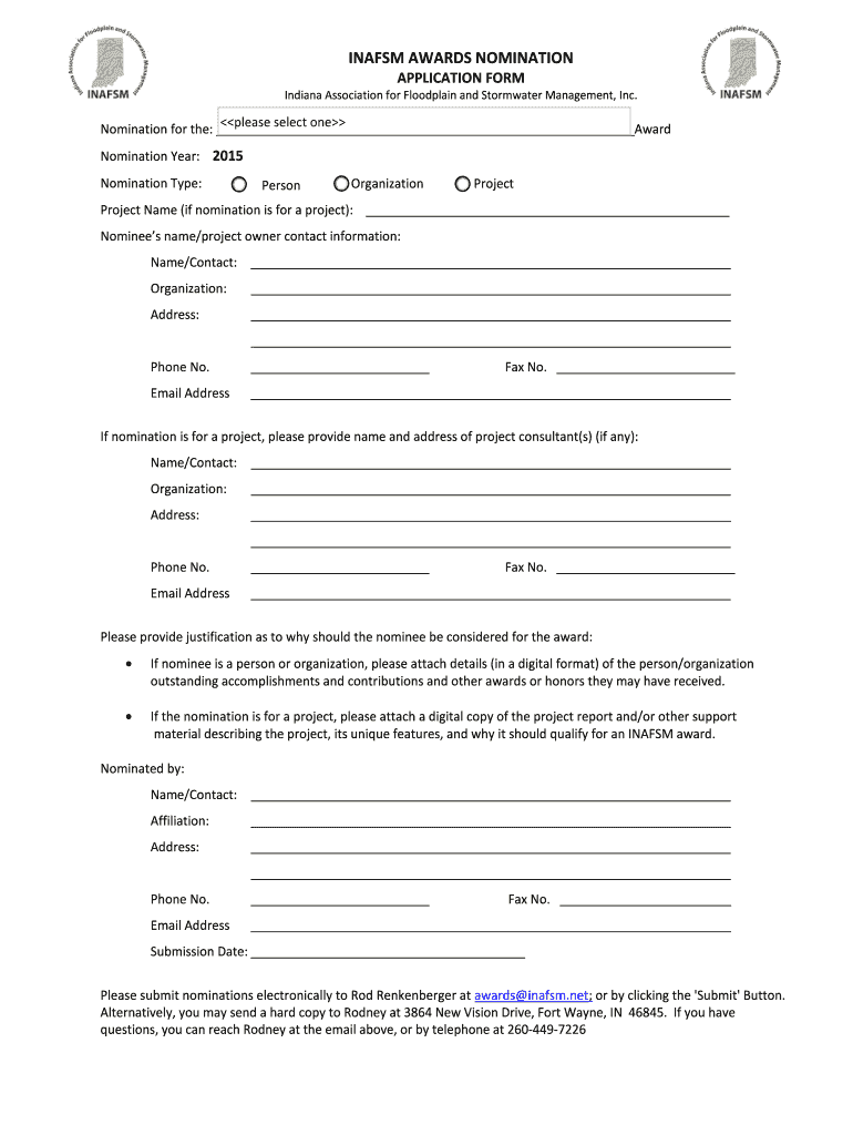 INA FSM AWARDS NOMINATION APPLICATION FORM Indiana Association for Floodplain and Stormwater Management, Inc. Nomination for the: Award Nomination Year: 2015 Nomination Type: Person Organization Project