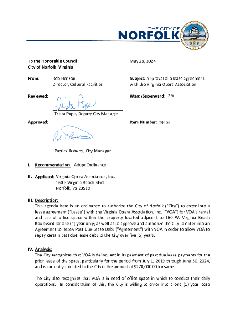 To the Honorable Council City of Norfolk, VirginiaMay 28, 2024From:Subject: Approval of a lease agreement with the Virginia Opera AssociationRob Henson Director, Cultural FacilitiesWard/Superward: