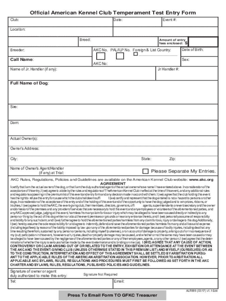 Official American Kennel Club Temperament Test Entry Form Date:Club:Event #:Location: Stakes: JC QCCAT OpenSpecial VeteranBreeder: Call Name:Breed:Amount of entry fees enclosed: $AKC No. PAL/ILP No.