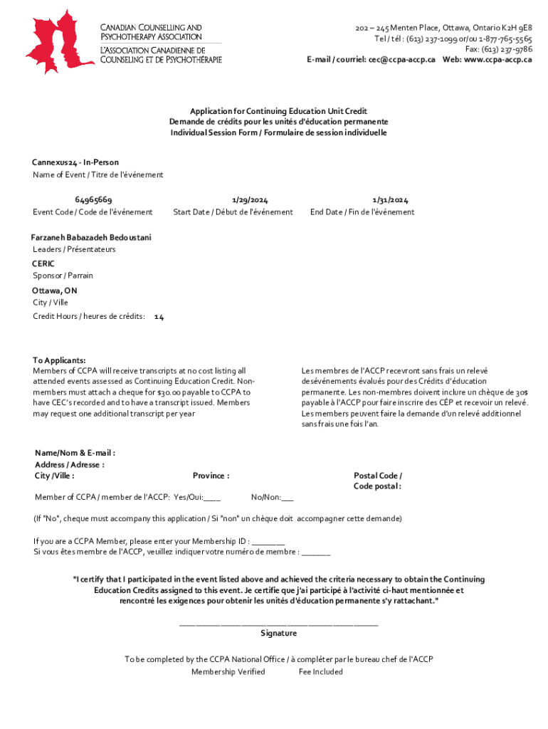202 245 Lenten Place, Ottawa, Ontario K2H 9E8 Tel / TL : (613) 2371099 or/of 18777655565 Fax: (613) 2379786 Email / courier: cec@ccpaaccp.ca Web: www.ccpaaccp.caApplication for Continuing Education