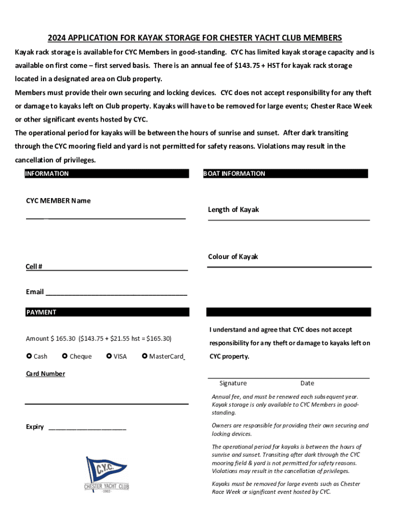 2024 APPLICATION FOR KAYAK STORAGE FOR CHESTER YACHT CLUB MEMBERS Kayak rack storage is available for CYC Members in goodstanding. CYC has limited kayak storage capacity and is available on first