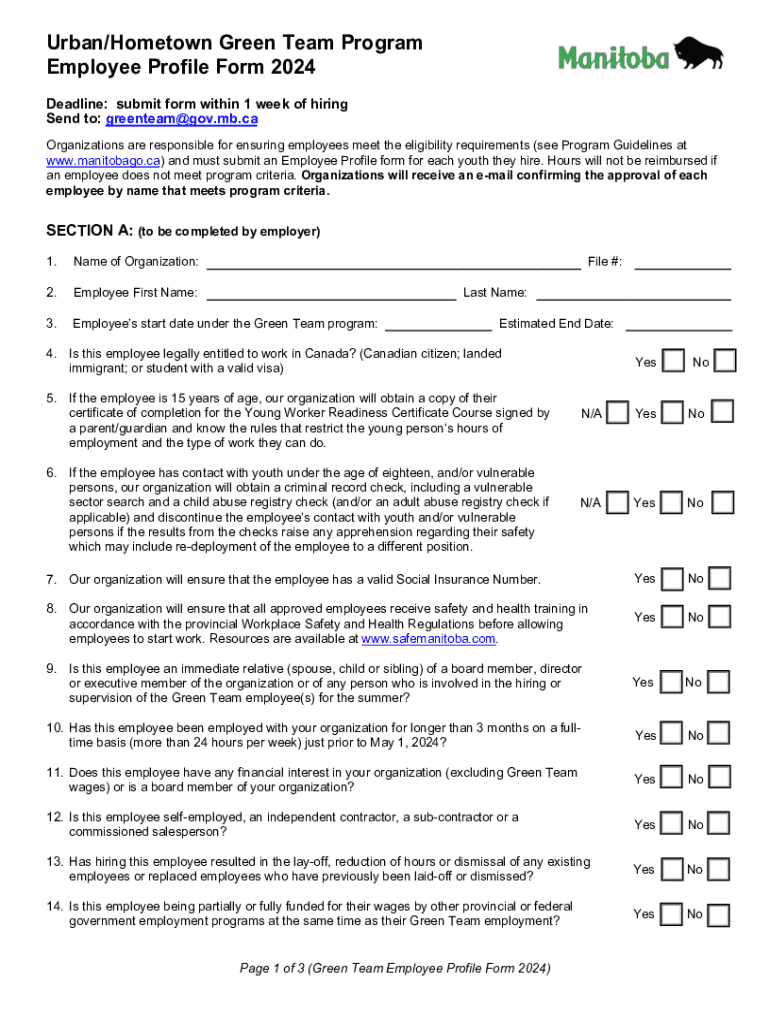 Urban/Hometown Green Team Program Employee Profile Form 2024 Deadline: submit form within 1 week of hiring Send to: greenteam@gov.mb.ca Organizations are responsible for ensuring employees meet the