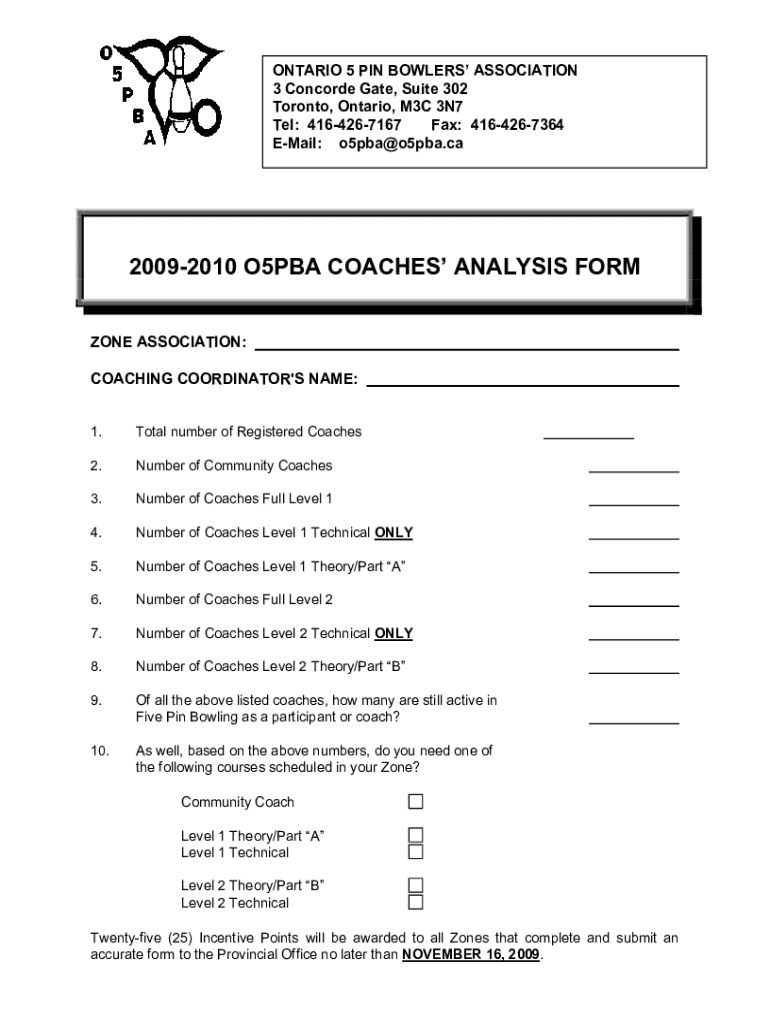 ONTARIO 5 PIN BOWLERS ASSOCIATION 3 Concorde Gate, Suite 302 Toronto, Ontario, M3C 3N7 Tel: 4164267167 Fax: 4164267364 Email: o5pba@o5pba.ca20092010 O5PBA COACHES ANALYSIS FORM ZONE ASSOCIATION: COACHING