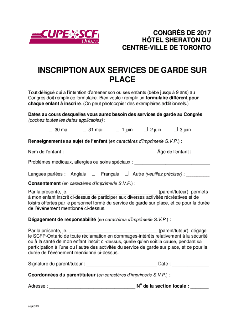 Obtenir le gratuit Formulaire d'inscription aux services de garde sur place