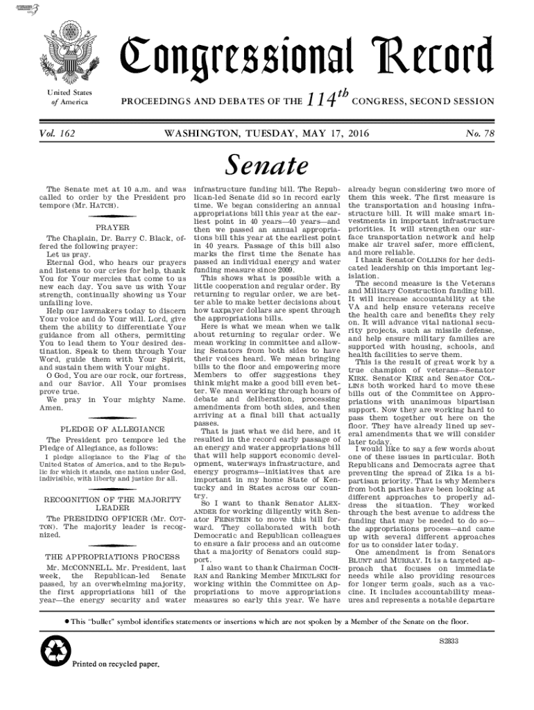 of AmericaPROCEEDINGS AND DEBATES OF Trevor. 162114 TH CONGRESS, SECOND SESSIONWASHINGTON, TUESDAY, MAY 17, 2016No. 78Senate