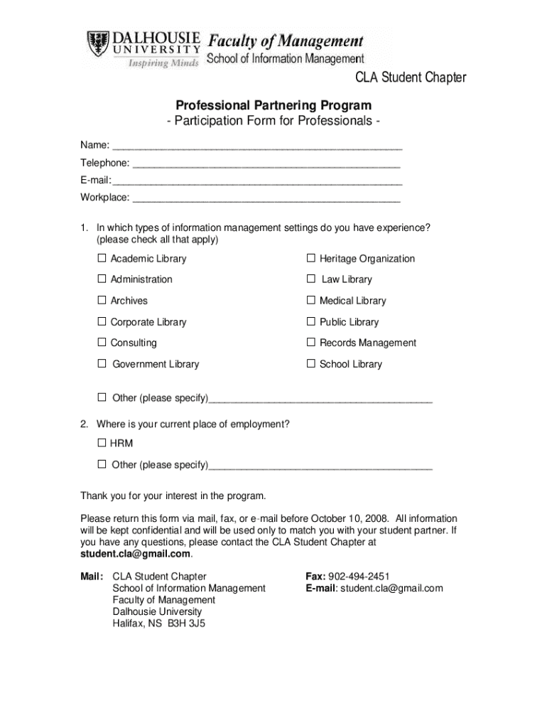 Participate in the CLA Student Chapter\'s Professional Partnering Program by filling out this form. Share your experience in information management settings and current employment details. Return the form before October 10, 2008, to be matched with a student partner.