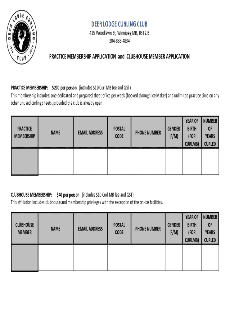 DEER LODGE CURLING CLUB 425 Woodlawn St, Winnipeg MB, R3J 2J3 2048884834PRACTICE MEMBERSHIP APPLICATION and CLUBHOUSE MEMBER APPLICATIONPRACTICE MEMBERSHIP: $200 per person (includes $10 Curl MB fee