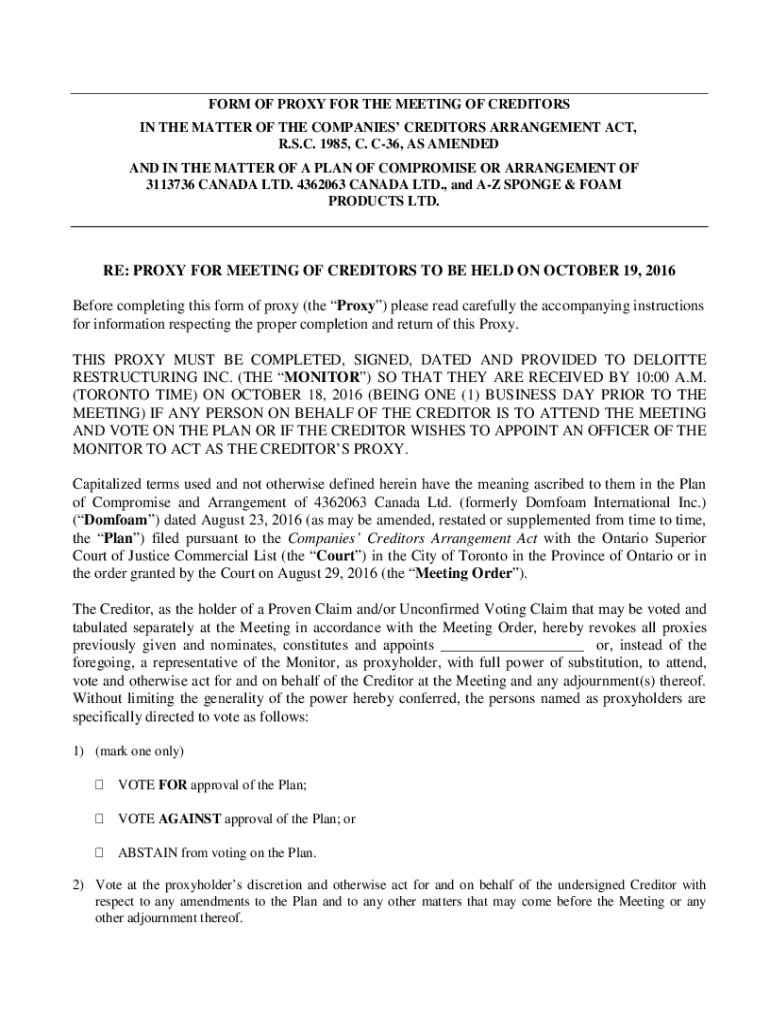 FORM OF PROXY FOR THE MEETING OF CREDITORS IN THE MATTER OF THE COMPANIES CREDITORS ARRANGEMENT ACT, R.S.C. 1985, C. C36, AS AMENDED AND IN THE MATTER OF A PLAN OF COMPROMISE OR ARRANGEMENT OF 3113736