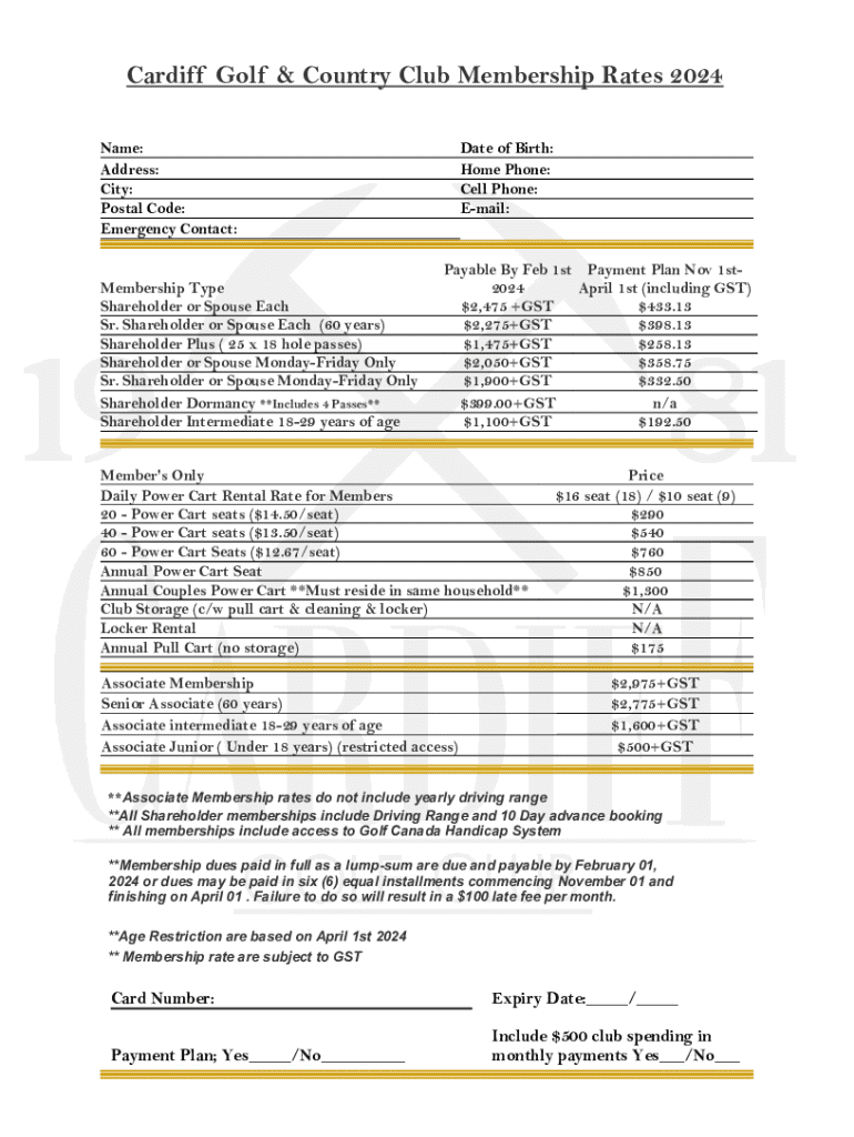 Cardiff Golf & Country Club Membership Rates 2024 Name: Address: City: Postal Code: Emergency Contact:Membership Type Shareholder or Spouse Each Sr. Shareholder or Spouse Each (60 years) Shareholder