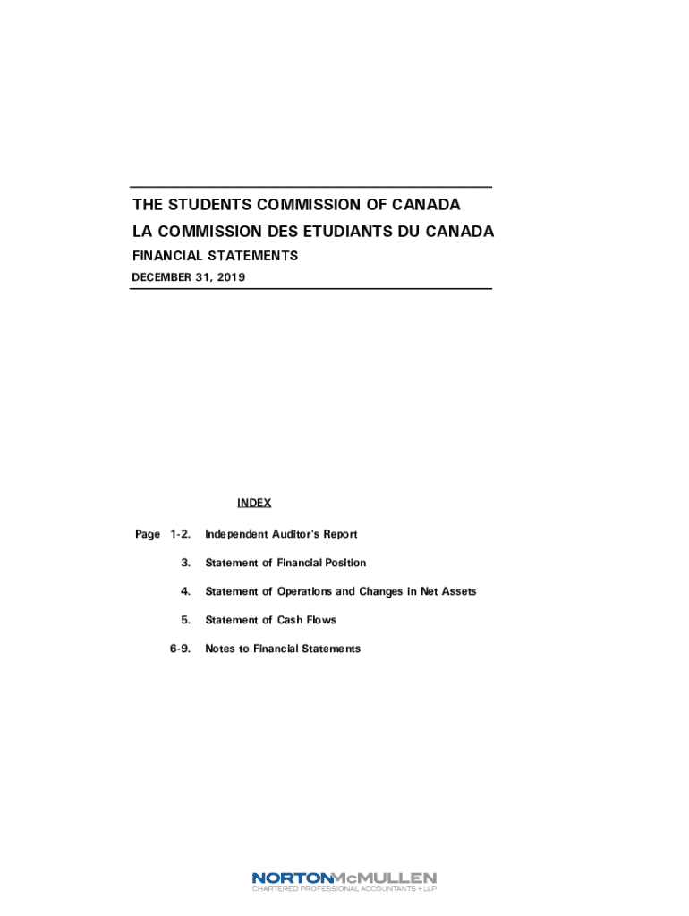 THE STUDENTS COMMISSION OF CANADA LA COMMISSION DES ETUDIANTS DU CANADA FINANCIAL STATEMENTS DECEMBER 31, 2019INDEX Page 12.Independent Auditor\'s Report3.Statement of Financial Position4.Statement