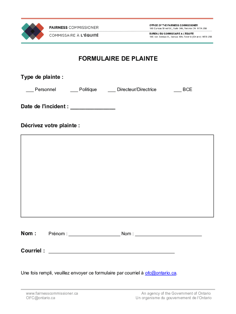 FORMULAIRE DE PLAINTE Type de plainte : ___ Personnel___ Politique___ Directeur/Directrice___ BCEDate de l\'incident : ___ Dcrivez votre plainte :Nom :Prnom : ___ Nom : ___Courriel : ___Une fois rempli,