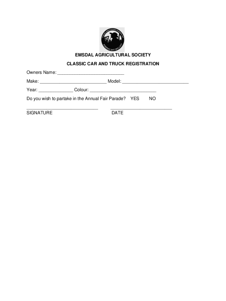 EMSDAL AGRICULTURAL SOCIETY CLASSIC CAR AND TRUCK REGISTRATION Owners Name: ___ Make: ___ Model: ___ Year: ___ Colour: ___ Do you wish to partake in the Annual Fair Parade? ___ SIGNATUREYESNO___ DATE