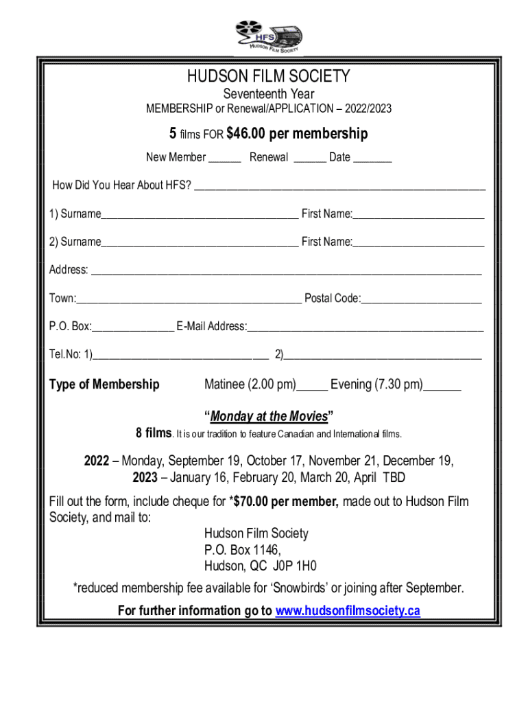 Seventeenth YearMEMBERSHIP or Renewal/APPLICATION 2022/20235 films FOR $46.00 per membership