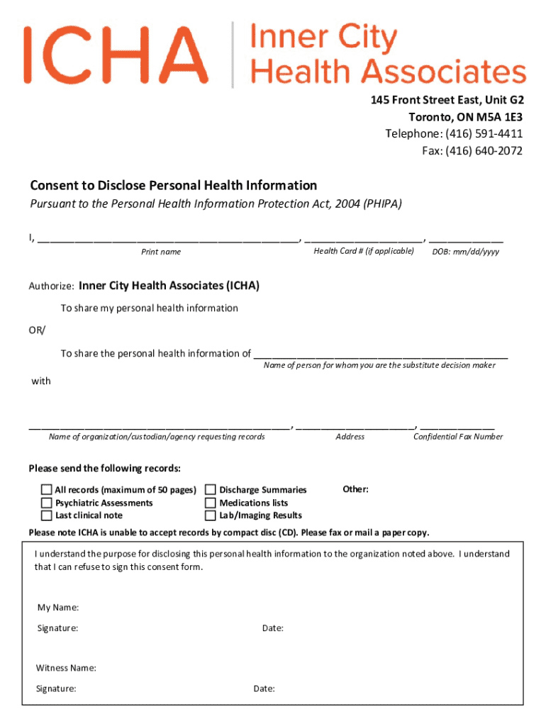 145 Front Street East, Unit G2 Toronto, ON M5A 1E3 Telephone: (416) 5914411 Fax: (416) 6402072Consent to Disclose Personal Health Information Pursuant to the Personal Health Information Protection