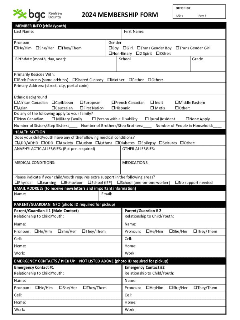 OFFICE USE2024 MEMBERSHIP FORM MEMBER INFO (child/youth) Last Name:IUD #Pym #First Name:Pronoun He/Him She/Her They/Engender Boy Girl Trans Gender Boy Trans Gender Girl NonBinary 2 Spirit Other: School