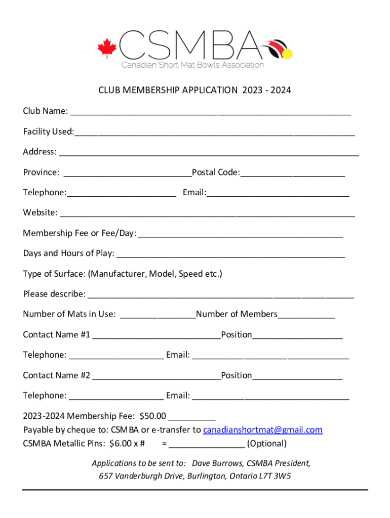 CLUB MEMBERSHIP APPLICATION 2023 2024 Club Name: ___ Facility Used:___ Address: ___ Province: ___Postal Code:___ Telephone:___ Email:___ Website: ___ Membership Fee or Fee/Day: ___ Days and Hours