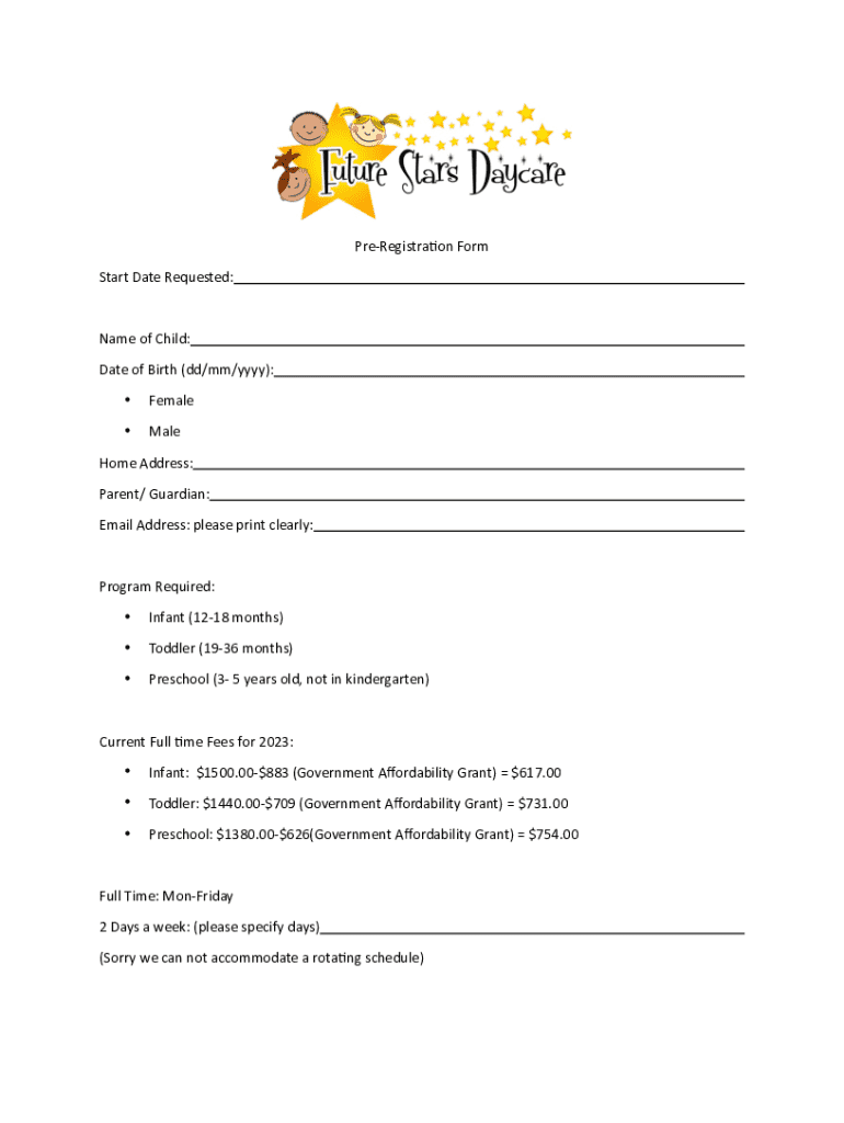 Preregister on Form Start Date Requested:Name of Child: Date of Birth (dd/mm/YYY): FemaleMaleHome Address: Parent/ Guardian: Email Address: please print clearly:Program Required: Infant (1218 months)Toddler