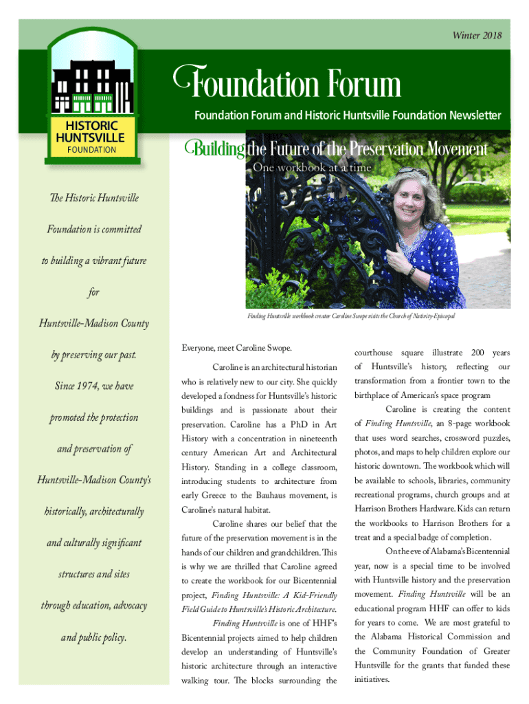 HISTORIC HUNTSVILLE FOUNDATIONWinter 2018Foundation ForumFoundation Forum and Historic Huntsville Foundation NewsletterBuilding the Future of the Preservation Movement One workbook at a timeThe Historic