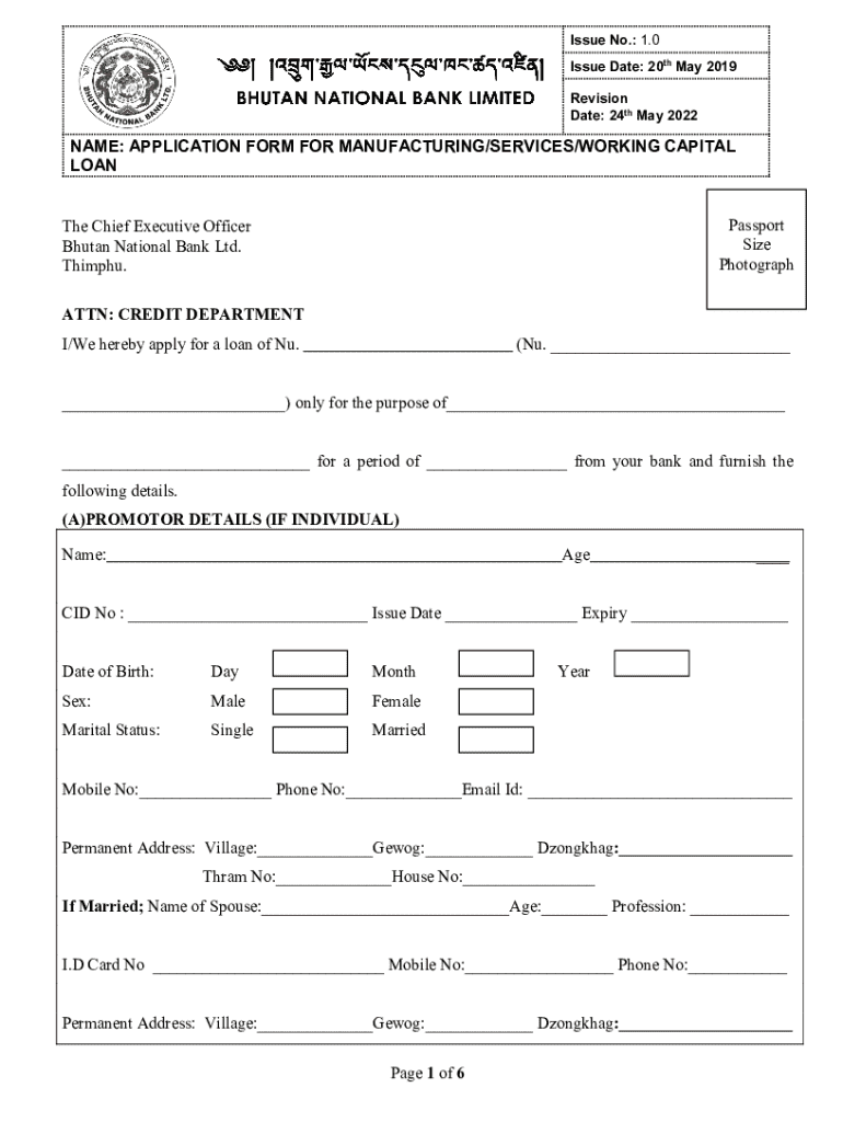 Issue No.: 1.0 Issue Date: 20th May 2019 Revision Date: 24th May 2022NAME: APPLICATION FORM FOR MANUFACTURING/SERVICES/WORKING CAPITAL LOAN Passport Size Photographs Chief Executive Officer Bhutan