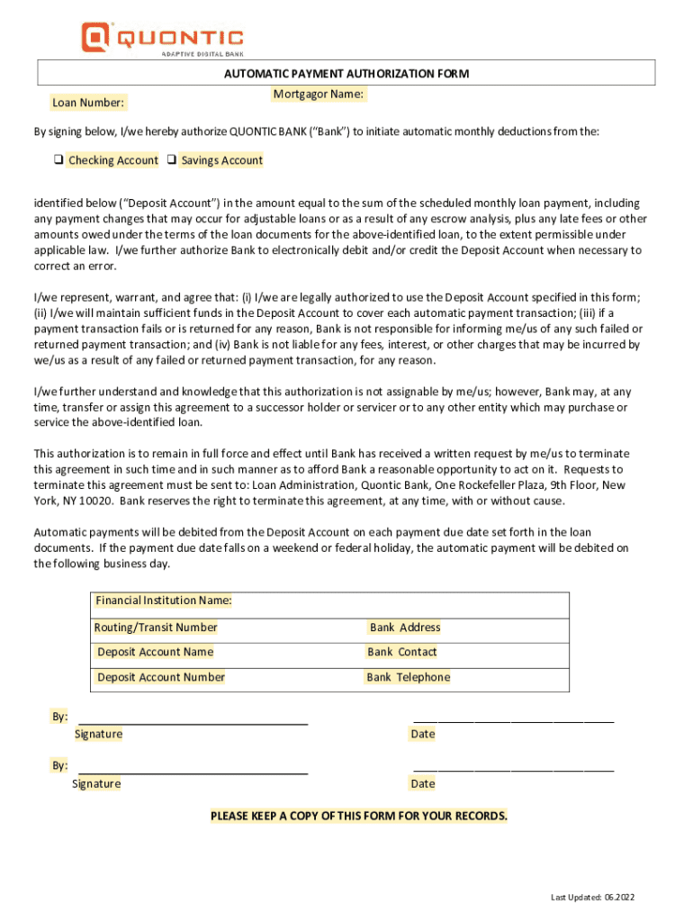 AUTOMATIC PAYMENT AUTHORIZATION FORM Mortgagor Name:Loan Number:By signing below, I/we hereby authorize QUENTIN BANK (Bank) to initiate automatic monthly deductions from the: Checking Account Savings