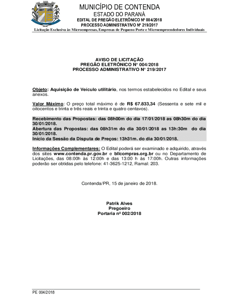 MUNICPIO DE CONTENDA ESTADO DO PARANTRABALHOPROGRESSO1421 15 25 1 C O N T E N D A 141EDITAL DE PREGO ELETRNICO N 004/2018 PROCESSO ADMINISTRATIVO N 219/2017Licitao Exclusiva s Microempresas, Empresas