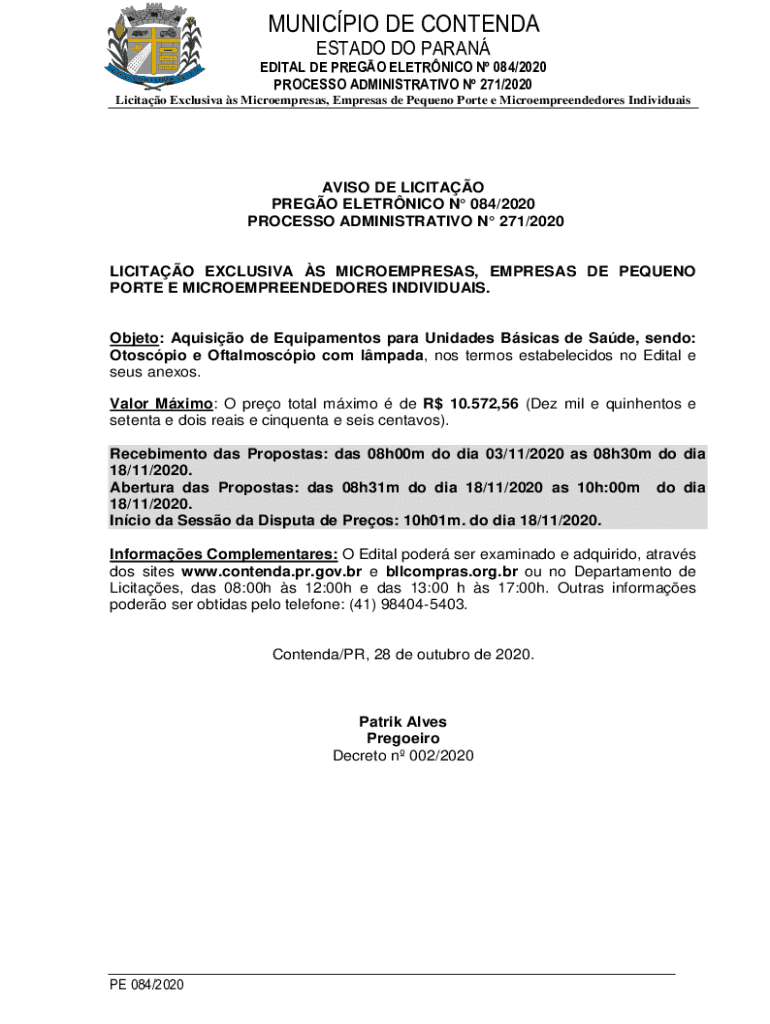 1 C O N T E N D A 141EDITAL DE PRESO ELECTRIC N 084/2020