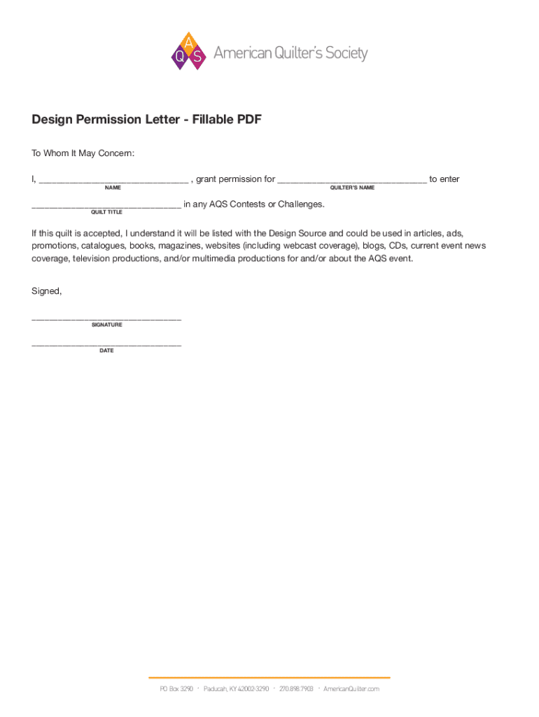 Design Permission Letter Fillable PDF To Whom It May Concern: I, ___, grant permission for ___ to enter NAMEQUILTERS NAME___ in any AQS Contests or Challenges. QUILT Title this quilt is accepted,