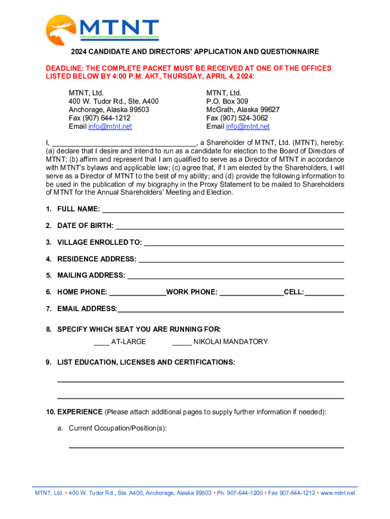 2024 CANDIDATE AND DIRECTORS\' APPLICATION AND QUESTIONNAIRE DEADLINE: THE COMPLETE PACKET MUST BE RECEIVED AT ONE OF THE OFFICES LISTED BELOW BY 4:00 P.M. AKT, THURSDAY, APRIL 4, 2024: MTNT, Ltd.