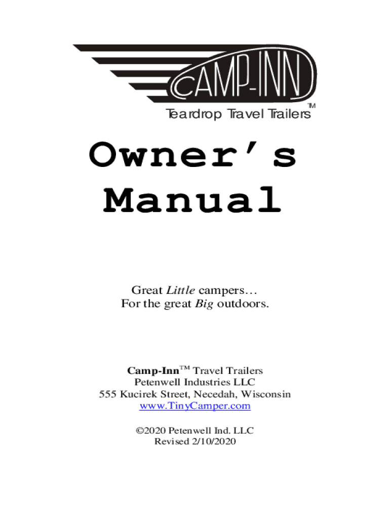 TMTeardrop Travel TrailersOwners Manual Great Little campers For the great Big outdoors.CampInnTM Travel Trailers Petenwell Industries LLC 555 Kucirek Street, Necedah, Wisconsin www.TinyCamper.com