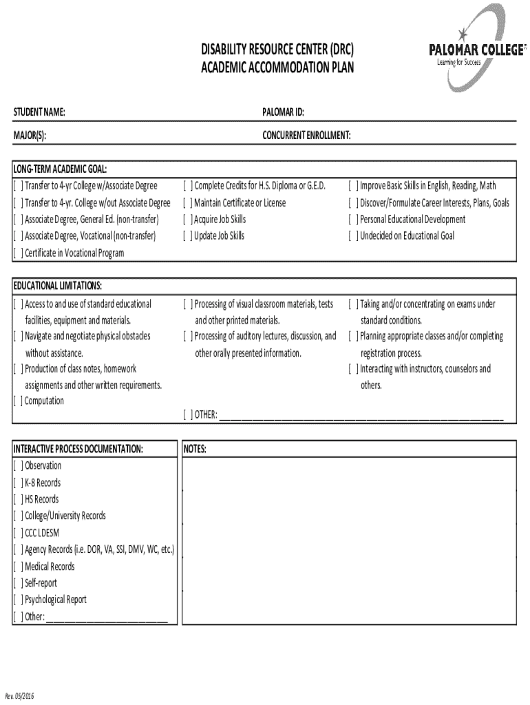 DISABILITY RESOURCE CENTER (DRC) ACADEMIC ACCOMMODATION PLAN STUDENT NAME:PALOMAR ID:MAJOR(S):CONCURRENT ENROLLMENT:LONGER ACADEMIC GOAL: [ ] Transfer to 4yr College w/Associate Degree [ ] Transfer